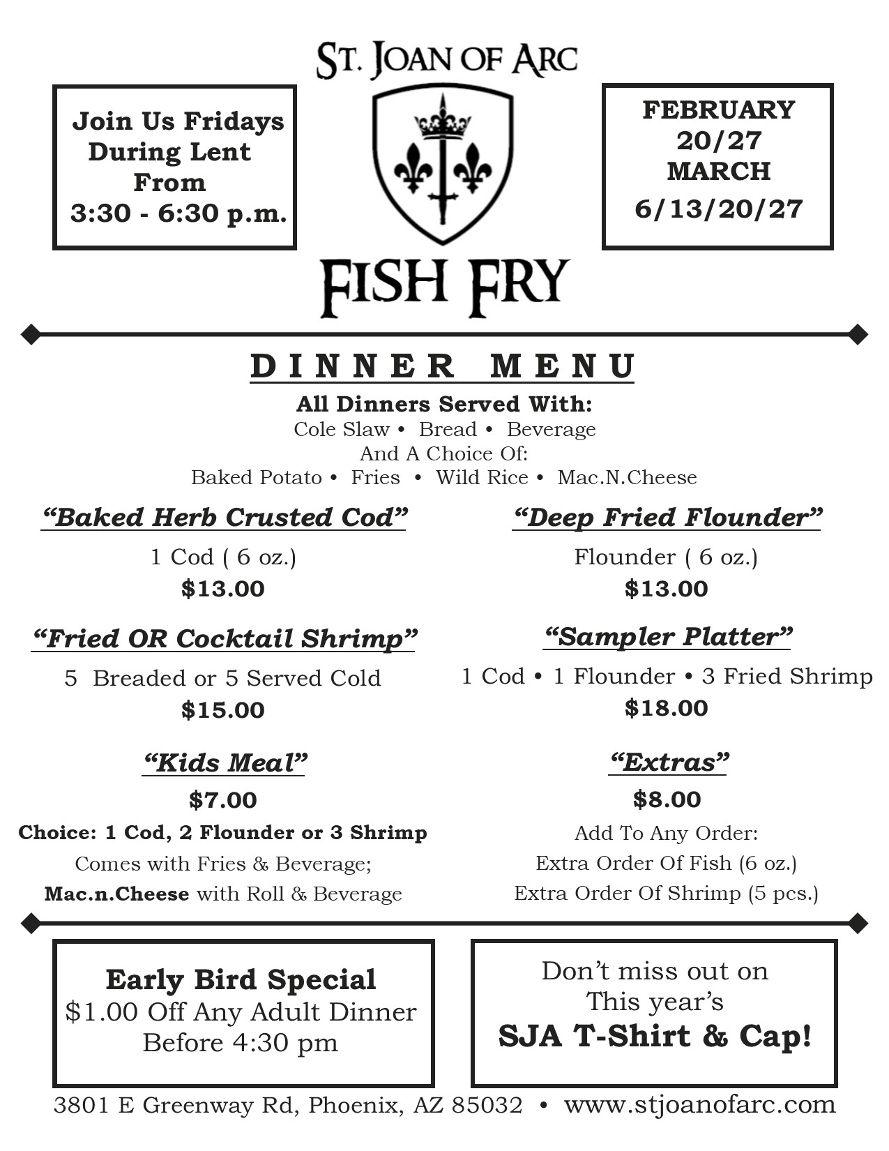 The St. Joan of Arc Lenten Fish Fry is back for its 34th year, and we can’t wait to serve you. Whether you’ve been coming for decades or this is your first time, join us for delicious food and even better company.